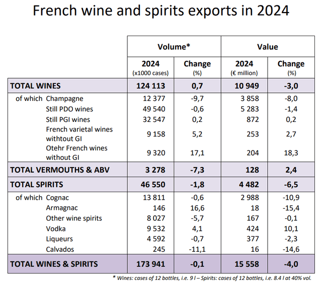 近日,法国葡萄酒和烈酒出口商协会(FEVS)发布了2024年法国酒类出口演讲,显示:法国2024年度全体酒类出口额为155。58亿欧元(约合人平易近币1180亿元),相较于2023年进一步下滑4%。正在此之前,2023年也同样录得同比5。9%的下滑,这标记着法国酒类出口总额已持续两年下滑,回到了2021年的出口程度。